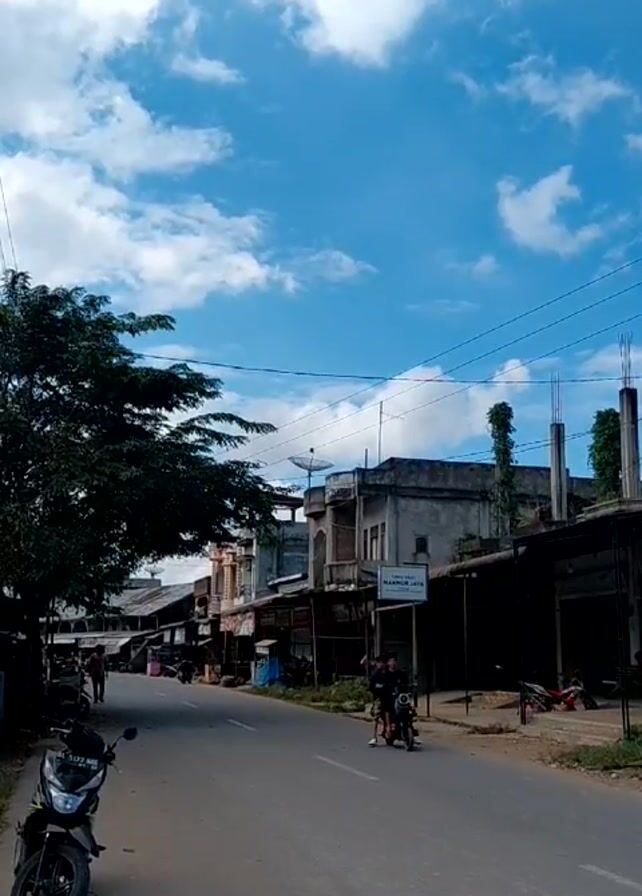 daytime scene on a street in a small town. The sky is a bright blue with scattered white clouds. Buildings line both sides of the street. Some are old and others appear to be under construction. A large tree stands on the left side of the road, providing shade. A black motorcycle is parked on the shoulder. In the distance, two people ride a smaller motorcycle. Power lines stretch across the sky. The road surface is cracked and worn.