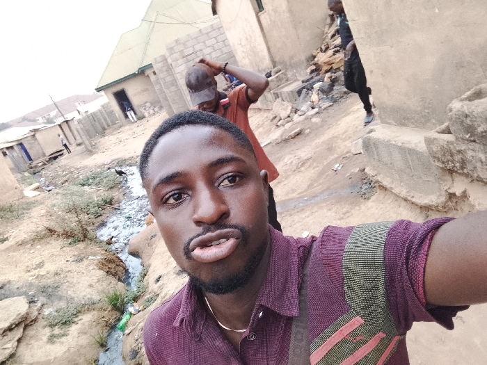 A selfie captures a man with dark hair and a beard, wearing a purple shirt and a gold necklace. Behind him, a dilapidated neighborhood scene unfolds. A small, polluted stream cuts through the landscape, reflecting the dull light. Dilapidated buildings and structures, seemingly in a state of disrepair, line the background. Additional figures are visible behind him, one wearing a red shirt and a cap, and another walking away. The scene projects a sense of poverty and neglect.