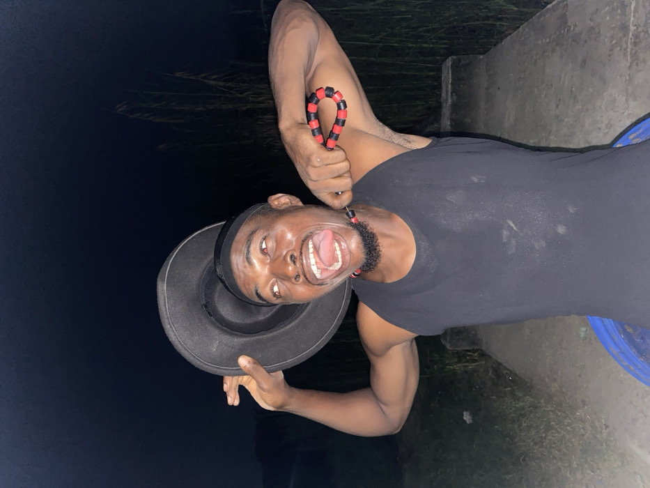 A man in a black tank top and hat stands outside at night. He holds a black and red beaded rope in one hand, and the hat in the other. He has his mouth open, his tongue sticking out. His skin is dark and his beard is short and neatly trimmed. The background is dark, with some grass visible in the foreground and a concrete wall in the background.