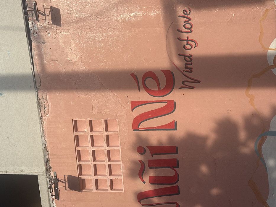 A faded peach-colored stucco wall forms the primary subject, displaying areas of wear and minor cracking, particularly along its upper edge where it meets a lighter, unpainted structure. In the upper left quadrant of the wall, a rectangular ventilation grate with a 4x4 grid of square openings is recessed. Two dark metal brackets are secured to the wall near the top, one above the grate and another to the right, both casting crisp shadows. Large red lettering, outlined in dark grey, reads "Mũi Né," with the initial characters of "Mũi" partially cropped on the left. Below and to the right of this, smaller cursive red text, also outlined in dark grey, states "Wind of love." The bottom portion of the wall reveals the upper section of a mural featuring stylized wavy lines in white, light blue, and orange. Strong directional light creates prominent shadows across the wall; a broad vertical shadow band runs down the right-center, partially obscuring the text, and mottled shadows from an unseen object cover the left and lower sections. No individuals or active interactions are depicted. This scene is located in the city of Thành phố Phan Thiết, Vietnam.