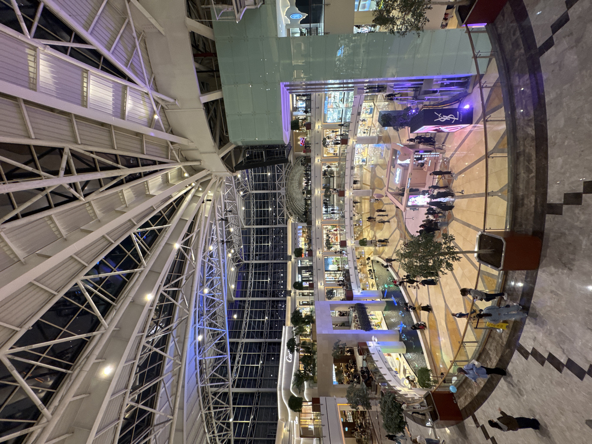 n interior view of the İstinyePark shopping mall, located in Sarıyer, Turkey. The mall has a multi-level design with multiple shops and brands visible. Shoppers are visible on various levels. The mall features a large, dome-like glass ceiling supported by a white metal framework. There are architectural structures with illuminated features and plant decorations. A Yves Saint Laurent advertisement is located in the middle of the mall on the ground floor.