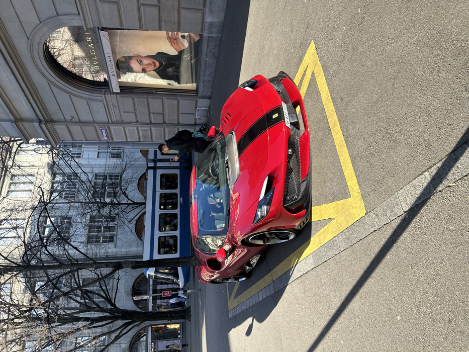 - "A bright red Ferrari 296 GTB, featuring a black racing stripe down its hood and a visible Swiss license plate "ZH 972 777", is parked on an asphalt surface within yellow painted box markings" by FM-Q2Ers1, licensed under CC BY 4.0
