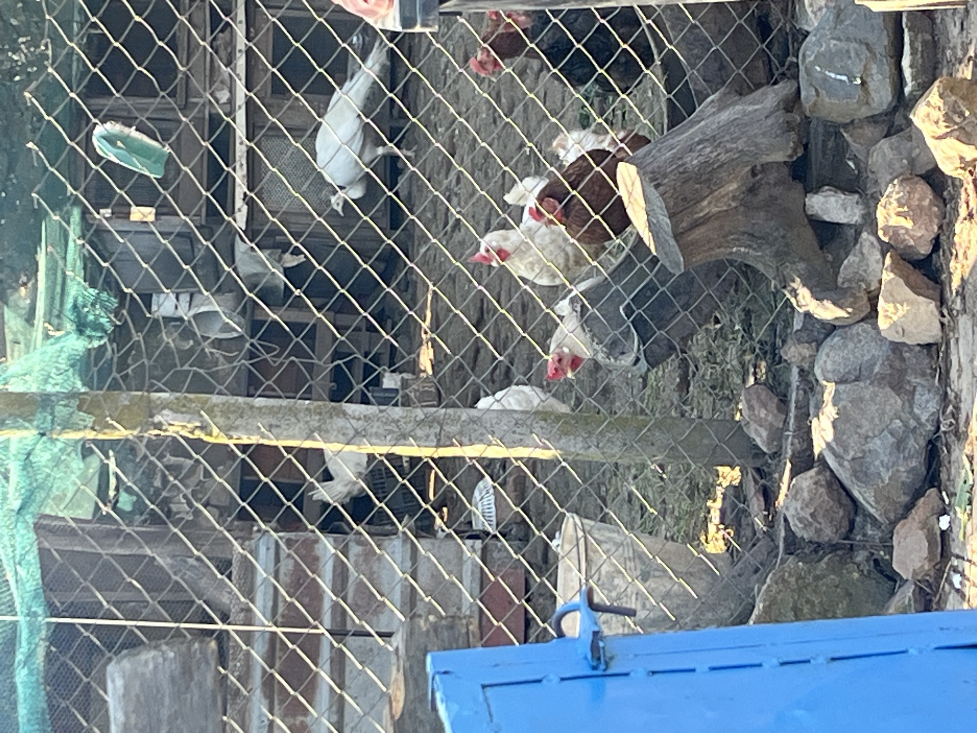 The image depicts a chicken coop or pen secured with wire mesh. Several chickens, varying in color from white to brown, are visible within the enclosure. A portion of a blue object is visible at the bottom of the image. The pen is partially bordered by rocks. The location is likely Varshilo, Bulgaria.