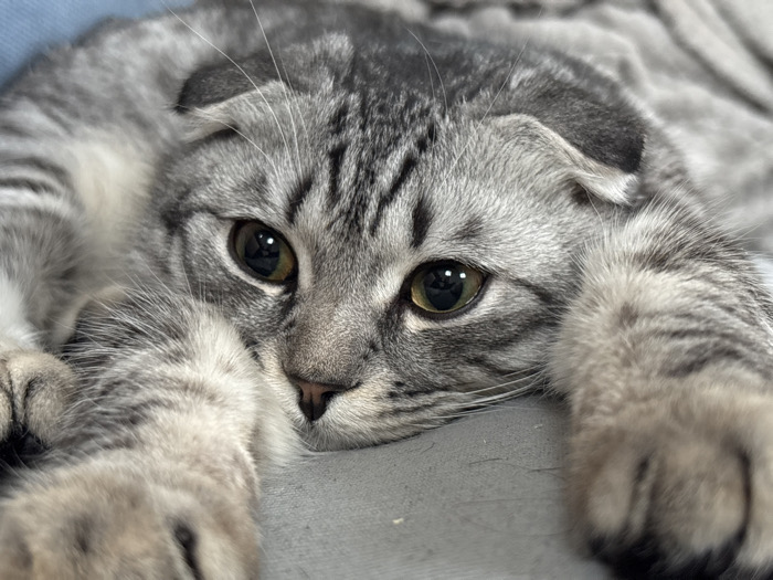 The image displays a domestic feline, specifically a silver tabby Scottish Fold cat, positioned centrally and horizontally