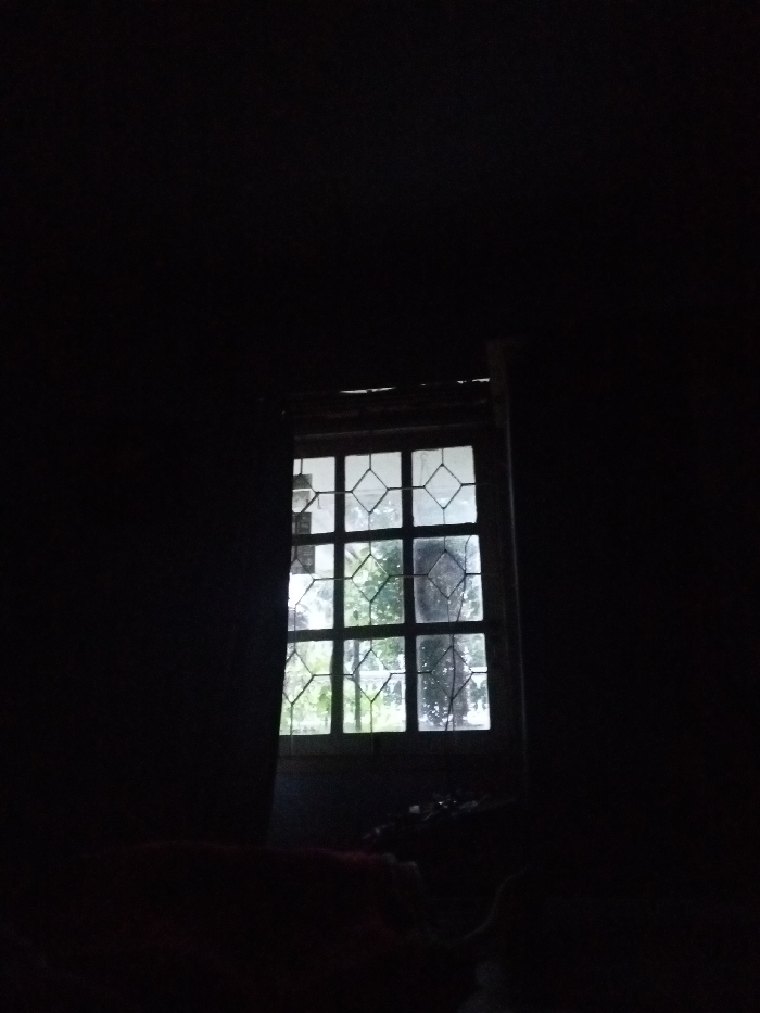 The scene depicts the interior of a dimly lit room in Qorday, Kazakhstan, looking outwards through a rectangular window. The window, centrally positioned, is the primary light source, illuminating portions of its multi-paned structure. Several glass sections within the window feature a distinct diamond-patterned grid. Outside the window, green foliage and tree branches are visible, indicating an outdoor, natural environment. The room's interior is largely shrouded in darkness; however, a dark red fabric, consistent with a blanket or textile, is partially discernible on an indistinct object in the lower foreground. No individuals, explicit actions, or interactions are visible within the frame.
