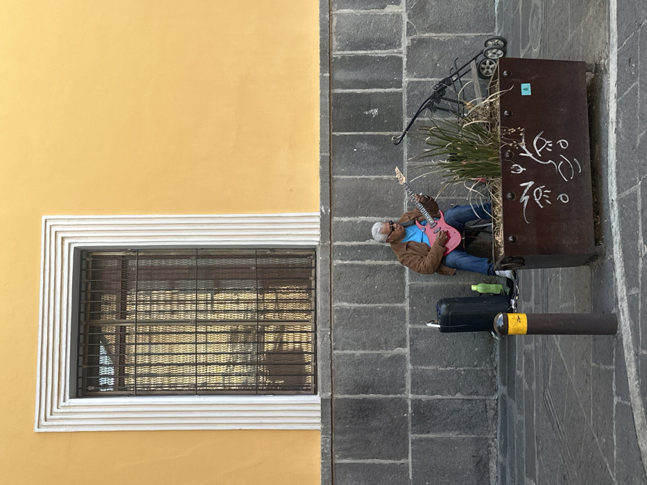 An elderly man with gray hair sits and plays a pink guitar on a cobblestone street. He wears a brown jacket and blue jeans, positioned next to a tall, dark metal planter with white graffiti. A yellow building with a window is on the left. A black guitar case and a yellow-striped bollard are nearby. The image is taken from an overhead perspective and rotated 90 degrees counter-clockwise.