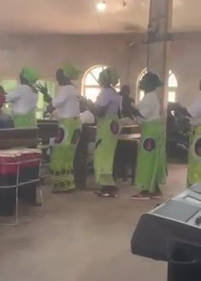 Several women stand, dance, and sing in a church. They wear matching green and white attire, including long skirts with a circular red emblem on them, white tops, and matching green head coverings. They move rhythmically, some raising their arms and clapping. A percussion instrument sits on a stand nearby. A keyboard is in the lower right corner of the frame. Church pews can be seen in the background. Arched windows and light coming through can also be seen.