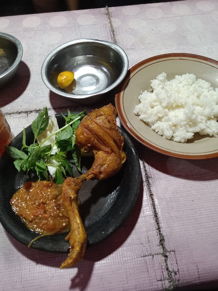 The image displays a close-up, slightly elevated view of a meal arranged on a light pink, textured table surface, likely within a casual dining establishment in Semarang, Indonesia. The central subject is a dark, textured stone mortar (cobek) serving as a plate, holding a piece of golden-brown fried chicken (ayam goreng) with visible crispy skin. Adjacent to the chicken is a generous portion of reddish-orange sambal, featuring visible chili pieces and a glossy texture. Accompanying the main protein are fresh green basil leaves and pieces of white cabbage or similar leafy greens, arranged as lalapan. To the right, a beige ceramic plate with a brown rim contains a mound of white, cooked rice. Above the main dish, a small stainless steel bowl is filled with clear water, containing a single yellow citrus fruit, typically used for finger rinsing. A portion of another identical stainless steel bowl is visible on the far left, and a glass containing a brown liquid is partially visible in the lower-left corner. The scene is illuminated by artificial light, casting soft shadows beneath the objects, suggesting an indoor or evening setting. No individuals are present in the frame.