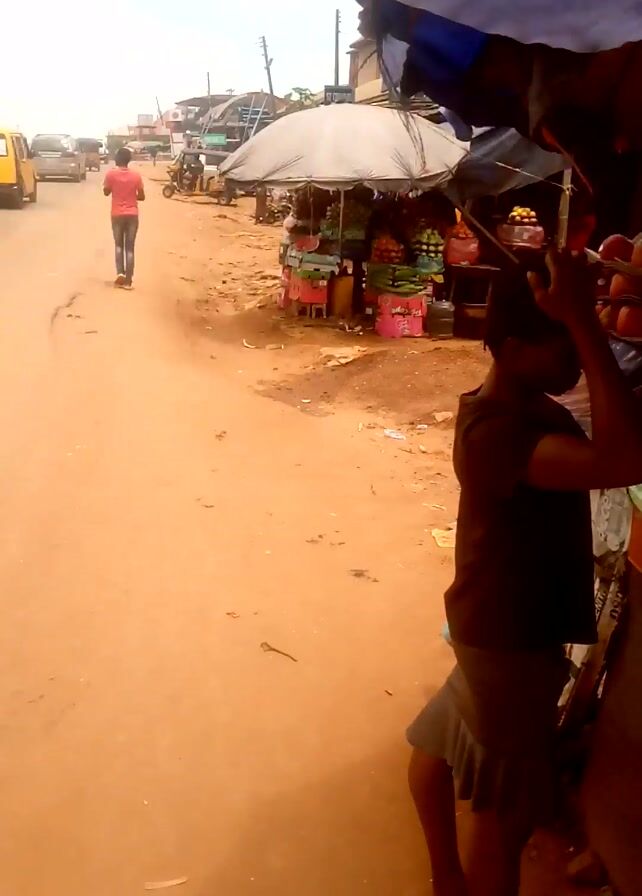 The video depicts an outdoor market scene. A person wearing a yellow shirt is visible among the stalls displaying various fruits. Another individual in a darker shirt is also present. The ground appears to be dirt or sand. A silver SUV is parked nearby, and there are some signs visible on nearby buildings. The market appears to be bustling with activity, with several stalls and people in the background.