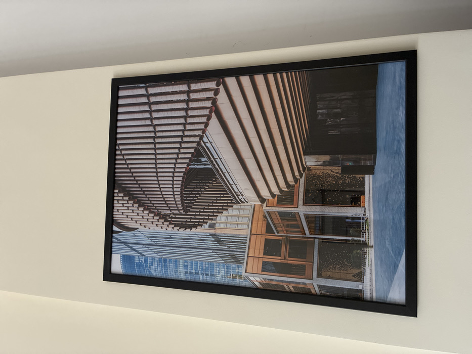 A vertically oriented photograph, encased in a black frame, is mounted on a cream-colored wall
