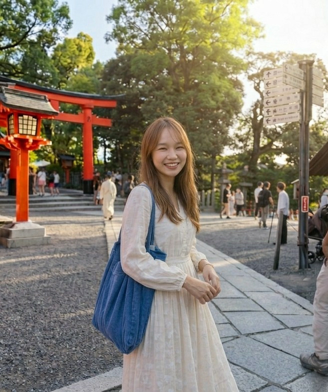 The image depicts a young East Asian female in the foreground, smiling directly at the viewer, positioned on a paved stone and gravel path. She has long, light brown hair with bangs and is wearing a long-sleeved, off-white, pleated maxi dress with a subtle textured pattern. A large, blue fabric tote bag is slung over her left shoulder. The scene is set outdoors at a traditional Japanese shrine in Kyoto, Japan, identifiable by the prominent red torii gate and an associated orange-red traditional lamp post visible on the left side of the background. Beyond these structures, a stone pathway ascends, flanked by steps, where several blurred figures are walking. One distinct figure, dressed in what appears to be a white or cream-colored traditional garment, is walking up these steps. On the right side of the background, a tall, grey multi-directional signpost with multiple white signs bearing Japanese characters points in various directions. Further along the path on the right, additional blurred figures of people are visible. Lush green trees with dense foliage are abundant throughout the background, indicating a natural, park-like environment. The scene is brightly lit by natural sunlight, suggesting a clear day, possibly late afternoon given the golden light filtering through the trees.