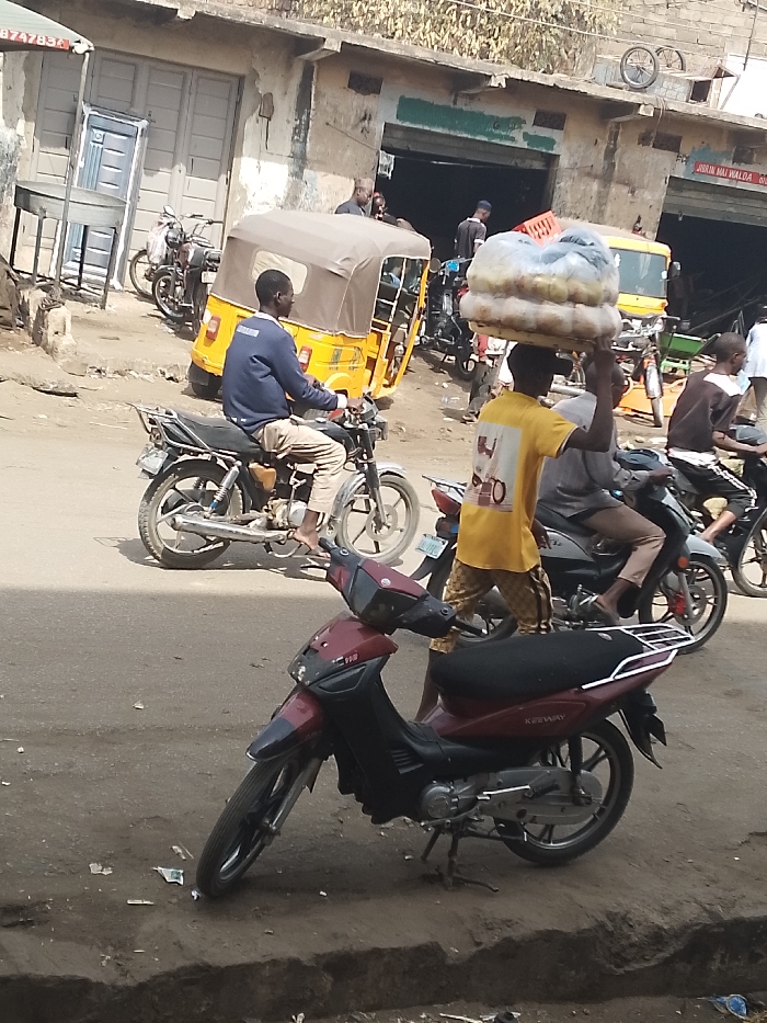 The image captures a bustling daytime street scene in Kofar Mazugal, Nigeria. In the foreground, a dark red and black Keeway brand scooter-style motorcycle is parked on a dirt shoulder, facing left, with its kickstand down. In the mid-ground, a young male, walking right to left, carries a large, light-colored round tray on his head. The tray is laden with multiple clear plastic bags, each containing several small, white, round items. He wears a yellow t-shirt with a graphic on the back and patterned light brown trousers. His feet are bare. To his immediate left, a male on a black motorcycle, wearing a dark blue long-sleeved shirt and light brown trousers, rides from left to right; his feet are bare on the footpegs. Behind the black motorcycle, a yellow three-wheeled motorized rickshaw with a light brown canvas roof moves or is positioned. Further right in the mid-ground, another male on a silver-grey motorcycle and a male on a dark-colored motorcycle are also present, moving in opposite directions. The background features single-story buildings with worn, light-colored concrete facades. The structure on the left has two large, closed, light-colored double doors and a metal table to its left. A light blue door frame leans against this building. The building on the right presents multiple dark, open bay-like entrances, possibly workshops or stores. The text "JIRIN MAI WALDA" is partially visible above one opening. A bicycle wheel hangs on the wall near the roofline of this building. Several other indistinct male figures are visible near the background structures. The street surface is a mix of unpaved dirt and worn asphalt, with scattered debris. Bright shadows indicate overhead sunlight.