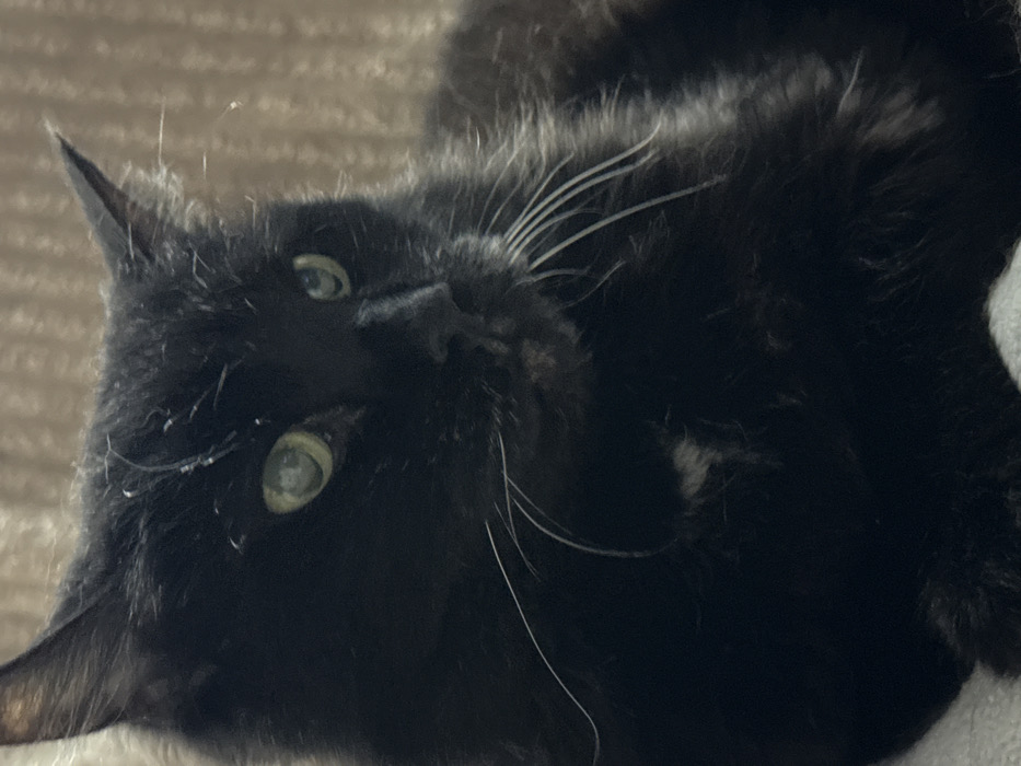 - "A close-up captures a black cat lying on its back, face tilted towards the camera" by FM-vBqzm1, licensed under CC BY 4.0