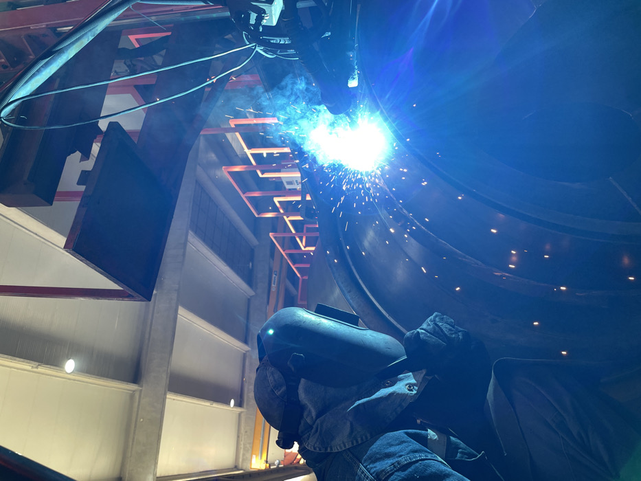 An industrial interior in Tomba, Montenegro, shows a welder engaged in metal fabrication