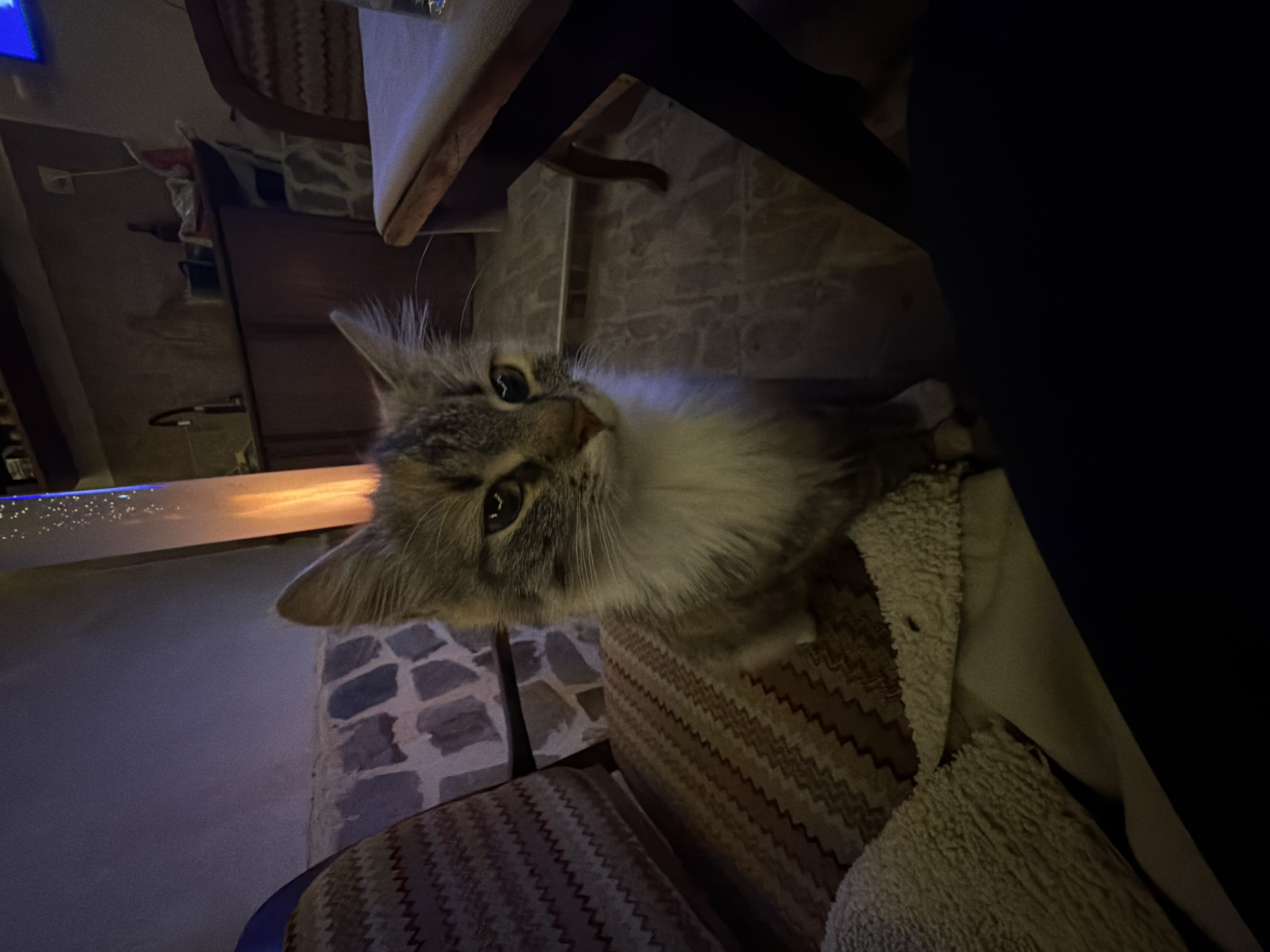 A domestic feline, displaying a calico-tabby pattern with gray, brown, and white fur, sits erect on a patterned cushion or chair. The cat's gaze is directed forward, its eyes open, with a distinct light reflection visible in the left eye. To the left of the cat, a patterned fabric chair back is visible, and below the cat, a cream-colored textured blanket or throw rests. The background includes a wall with a lower section of irregular light-colored stone or tile, surmounted by a smooth, light-toned wall. A tall, cylindrical decorative lamp emits warm orange light at its base and cool blue light with bubble-like effects higher up. To the right, a wooden table with a light-colored surface and a dark-framed chair are partially visible. Beyond this, a kitchen area with dark cabinetry, a faucet, and miscellaneous objects on the counter is evident. The flooring is tiled. Dark fabric, consistent with human clothing, occupies the lower right foreground, indicating an observer's close proximity. The setting is an interior space in Kavrakirovo, Bulgaria.