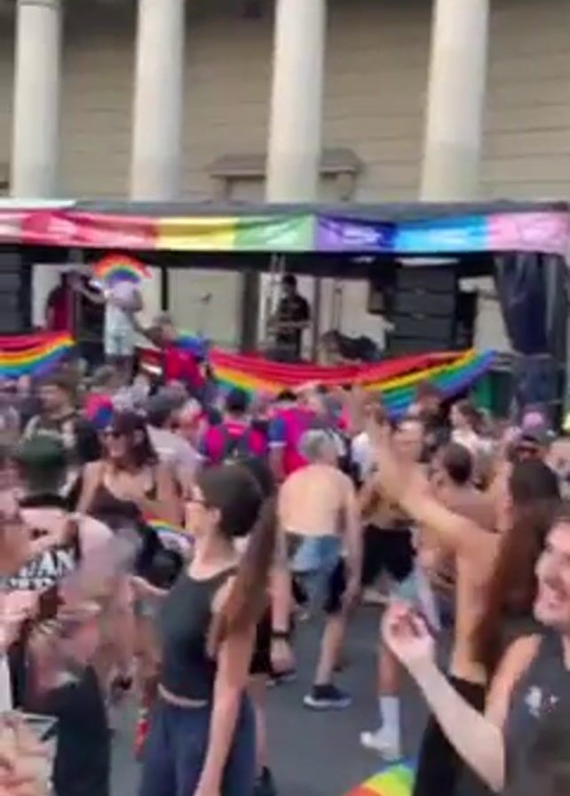A large crowd of people are dancing in a plaza or street, with a truck or float covered in rainbow flags serving as a stage for musicians. The crowd is diverse in age and appearance, with many wearing casual clothing. Some people are shirtless. Buildings with classical architecture, including columns and decorative facades, surround the plaza. The atmosphere appears festive, with people raising their arms and enjoying the music.