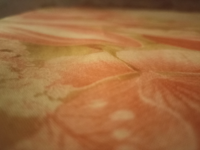 The scene, located in Unknown, Unknown, presents a close-up, low-angle perspective of a patterned textile surface. The fabric exhibits an abstract design characterized by soft, irregular shapes in a color palette dominated by light orange, peach, cream, and subtle yellowish tones. Visible folds and creases traverse the surface, notably towards the center-right. The material displays a soft, possibly fuzzy texture. The depth of field is shallow, rendering the background progressively out of focus. Lighting is diffuse, providing an even illumination across the visible area of the textile. No individuals or additional objects are present.