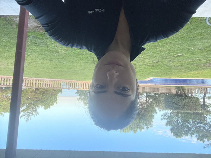 A female individual is positioned in the foreground, facing the camera and capturing a selfie. She has dark hair pulled back, dark eyes, and a neutral facial expression with a slight smile. She is wearing a black long-sleeved top with a quarter-zip collar, displaying a "Columbia" logo on her left chest area. A small stud earring is visible in her left ear. The background depicts an outdoor residential setting, observed from a shaded vantage point, likely a porch or patio, with a concrete ceiling and a dark red vertical post framing the right side. Beyond the individual is a well-maintained green lawn. To the left of the lawn, a blue rectangular swimming pool is visible. Further back, a low wooden fence or railing separates the property from a line of evergreen trees. One tree in the mid-left background exhibits a distinct, pruned square-shaped canopy. Beyond the trees and fence, a body of water, likely the sea, extends to the horizon under a clear blue sky with minimal cloud cover. The scene is brightly illuminated by daylight. The location depicted is Vilar, Spain.