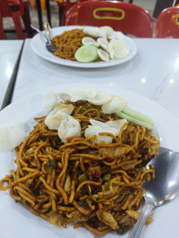 Two plates of mie goreng, Indonesian fried noodles, are presented on a white table. The noodles are topped with kerupuk (crackers) and cucumber slices. A silver spoon sits beside the front plate. The noodles appear stir-fried with vegetables and spices. In the background, red and orange chairs are visible. The table has a glossy, light-colored surface.