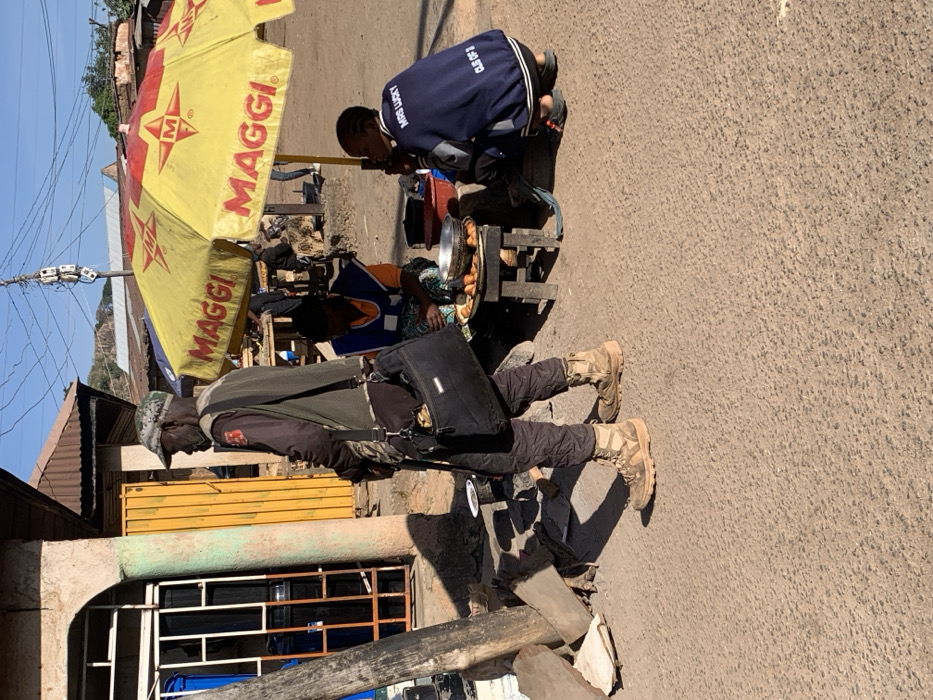 A street scene shows two people. One person wears military-style boots, dark pants, a green vest, and a cap. They stand with a black bag over their shoulder. Another person, wearing a dark blue shirt with white lettering, kneels by a small cart with round objects on it. Above the cart, there is a yellow umbrella with the word "MAGGI" printed on it. The scene unfolds on a paved street next to buildings.