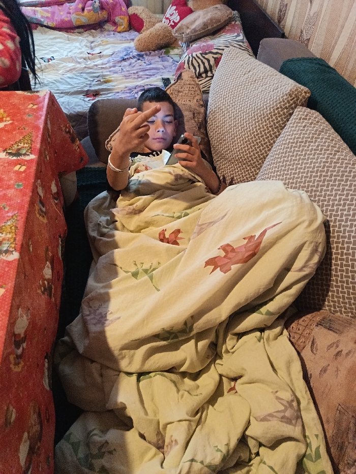 An indoor scene in the city of Roman, Bulgaria, depicts a young male, appearing pre-teen or early teen, reclining in a cluttered domestic setting