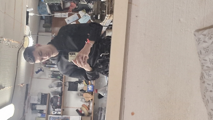 The image displays a young adult male taking a mirror selfie in an interior room located in the city of Strashimirovo, Bulgaria. The male subject, with short dark hair, is wearing a black hooded sweatshirt and dark pants, and has a red and white wristband on his left wrist. He holds a light-colored smartphone with multiple rear cameras in both hands, positioned to capture his reflection. The reflected background reveals an organized, utility-style room. Two wooden shelves are mounted on a light-colored wall. The upper shelf contains various items including bottles, containers, a white electronic device, and a light-colored sneaker. The lower shelf holds additional bottles, containers, and miscellaneous objects. A clear plastic bottle with a red cap is positioned on a counter-like surface below the lower shelf. To the right of the subject's reflection, a metal vice is affixed to a wooden base on the same surface. The ceiling, also light-colored, features exposed wiring, a circular light fixture, and decorative string lights. Papers are tacked to the wall in the upper right, near a white USB charger cable. A light-colored horizontal wooden panel forms a partition across the lower mid-section of the frame. Below this panel, a textured, light-colored wall is visible. The bottom foreground shows a white fabric with a gray leaf pattern, consistent with bedding or a pillow.
