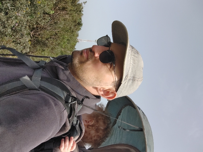 An adult male is depicted in a medium shot, facing slightly to his left while carrying an infant in a baby carrier backpack