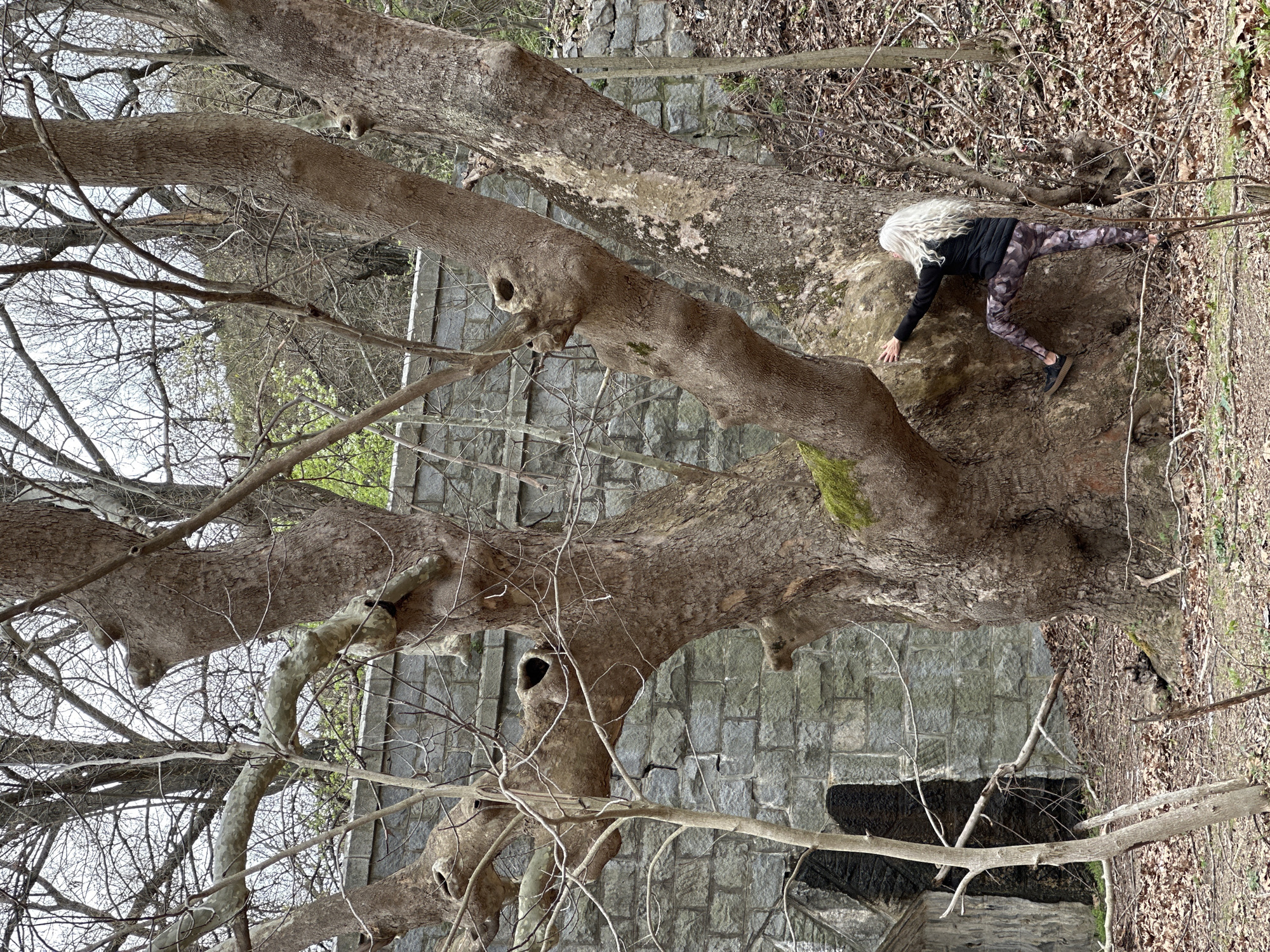 An eye-level, medium shot shows a woman with white hair climbing on a large tree in an outdoor environment. The photo appears to be taken in a forested area near Stara Kresna, Bulgaria, judging by the stone architecture in the background. The woman is wearing dark clothing, including a jacket and leggings with a camouflage pattern. She is in the process of traversing the side of the tree trunk, using her hands for support. The tree itself is a prominent feature of the scene, with a thick trunk and numerous branches. The background includes a stone wall and foliage, suggesting a natural or park-like setting. Fallen leaves are scattered on the ground around the tree.