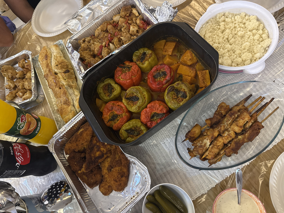 The image captures an overhead view of a dining table laden with a substantial meal in Holon, Israel