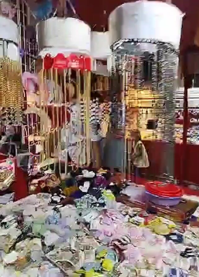 stall at a market. Hanging from the stall roof are three cylindrical structures, from which beaded jewelry cascades down. Below, a table is piled high with various accessories, primarily hair clips and barrettes in a variety of colors and designs. A man wearing a blue Paris Saint-Germain jersey is present on the left side of the screen, and other individuals can be seen moving about in the background.