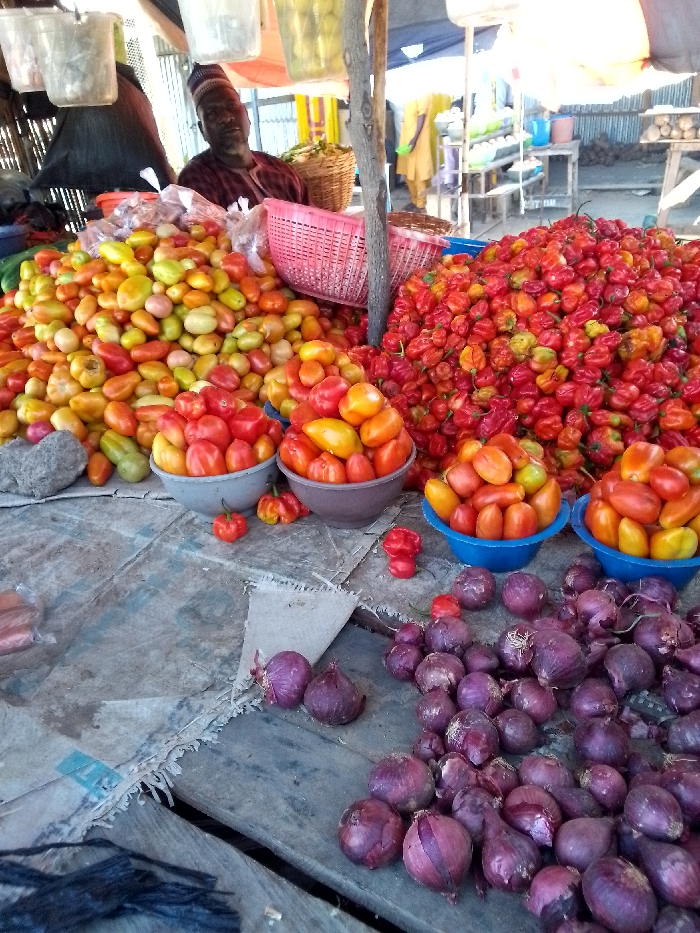 This image depicts a market stall in Dabawa, Nigeria, showcasing a variety of fresh produce