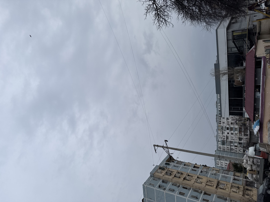 cloudy sky above buildings. An apartment building with many windows occupies the lower right. A taller building is situated behind it, and another building with a white facade is on the right edge. Power lines stretch across the sky, intersecting at various points. A utility pole is attached to the apartment building. Bare tree branches are visible in the top right corner, and a small bird flies in the sky.