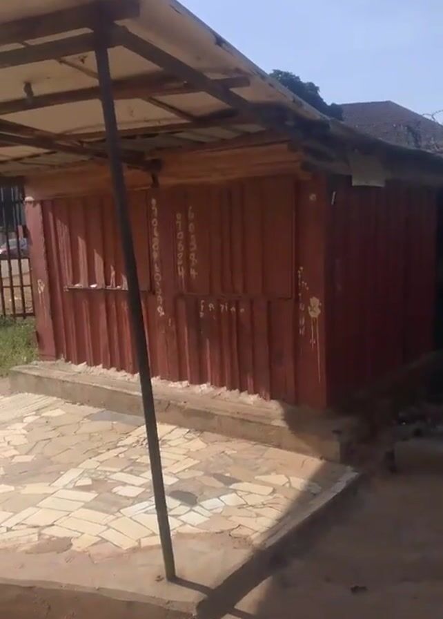 small, reddish-brown metal structure, possibly a repurposed shipping container, that appears to be a vendor's stall or small shop. It is covered by a worn-looking, makeshift roof supported by a metal pole. The base of the stall is a raised platform paved with light-colored tiles in a mosaic pattern. In the background, there is a metal fence, some greenery, and what appears to be another building. The scene is captured in daylight, with shadows cast by the structure. There's no visible human activity in the video. The camera seems to be stationary, providing a fixed perspective of the scene.