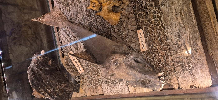 The image displays a static exhibit behind glass, likely within a museum or a similar establishment in Austin, United States of America. Two taxidermied fish specimens are centrally featured. On the left, a dark, flattened, broadly-shaped fish with visible teeth and circular eye sockets rests on a fishing net. A label partially obscured below it reads "Man-Eating Piranha." To its right, a long, slender, dark-colored fish with an elongated snout, visible teeth, and a pronounced dorsal fin is displayed. A label below this specimen explicitly identifies it as "Baboon Fish." Both fish are positioned on a light brown, coarse fishing net, which is laid over rustic, light-colored wooden planks forming the base of the display. An irregularly shaped, yellowish-brown organic object is visible to the right of the "Baboon Fish." The reflective surface, presumably glass, shows several bright, linear blue-white light reflections. No people are present in the scene.