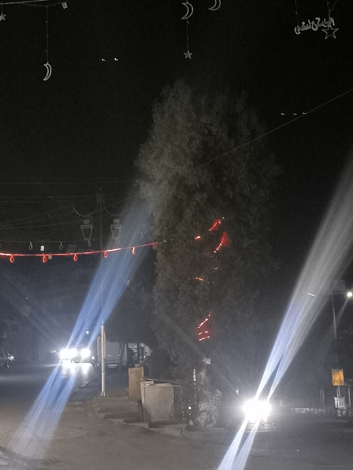 Night scene on a street with a large tree decorated with red lights. Car headlights shine brightly, creating light trails. Overhead, strings of lights with crescent moon and star shapes are strung across the street. Two lights appear to be glowing like eyes in the distance above the tree. Other decorations include a string of red teardrop-shaped lights and Arabic script on strings.