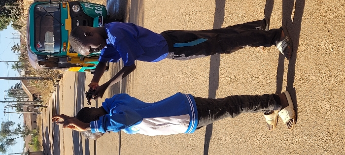 Two boys are outside, with the top one holding what seems to be a handgun pointed at the one below. The boy on top wears a blue shirt, while the other is in a blue jacket. Both have on dark pants and sandals. An auto rickshaw is parked beside them on the road. They are casting shadows on the asphalt.