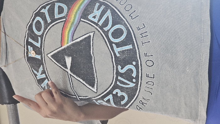 A gray T-shirt features a circular emblem. The words "Pink Floyd" are arranged on the top left curve, while "73 U.S. Tour" adorns the bottom left. "Dark Side of the Moon" completes the circle on the right. A prism refracting light into a rainbow sits within the circle's center, positioned above a dark triangle. A hand extends into the frame, pointing towards the shirt. A delicate gold chain necklace is visible. A blue object is present on the far right edge.