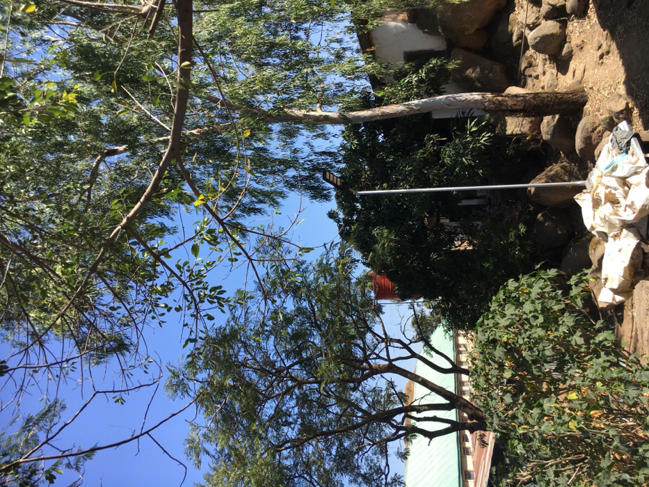 This image depicts an outdoor, sunlit scene in Jos, Nigeria, characterized by natural rock formations and dense vegetation under a clear, bright blue sky. In the foreground, a tall, slender metallic street light pole, equipped with a solar panel at its apex, stands on an unpaved, earthy ground. At the base of this pole, a pile of crumpled white sacks rests. Numerous large, irregular dark grey and brown rock formations are scattered across the ground, particularly prominent on the right side of the frame. Various trees with green foliage dominate the middle and upper sections of the image. A large tree with a light-colored trunk and weeping-style branches is positioned on the right, partially obscuring a white-walled building section with a darker roof or upper wall. To the left of the street light, a dense, dark green bush occupies the immediate foreground. In the mid-ground, behind the foliage, a red plastic water storage tank is visible. Further to the left and in the background, a building featuring a light green, possibly corrugated metal, roof is partially discernible among the trees. The overall environment suggests an undeveloped or semi-developed area with significant natural elements. No individuals or discernible activities are present.