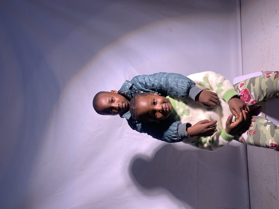 An image taken in Jos, Nigeria, depicts two children posing against a plain, light-colored fabric backdrop with visible wrinkles and shadows