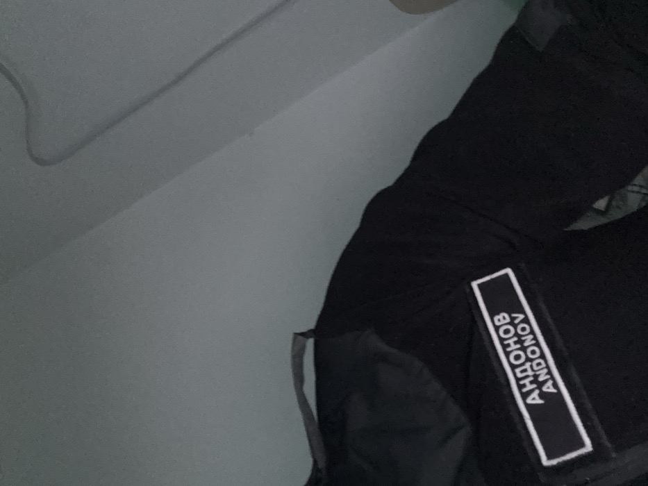 A close-up photograph depicts the upper torso and left shoulder of an individual wearing a dark, possibly black, jacket or uniform. Affixed to the garment is a black rectangular name patch with a white border, displaying the surname "АНДОНОВ" (Cyrillic) above "ANDONOV" (Latin) in white embroidered text. The background is a uniformly light gray, curved interior surface, indicative of a vehicle headliner or an indoor ceiling. The scene is located in Sofia, Bulgaria. No specific actions or interactions are discernible. Lighting is indirect and appears subdued.
