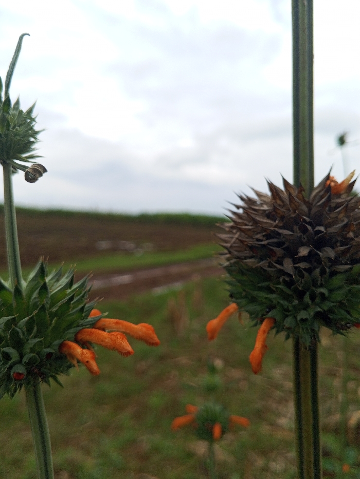 The image, located in Keyian ward, Kenya, presents a close-up view of two distinct plant stalks in an outdoor, rural setting beneath an overcast sky. The prominent plant on the left features a green stem and a green, spiky, spherical cluster of bracts from which multiple bright orange, tubular florets emerge horizontally. A small, dark-shelled snail is perched on the upper section of this plant's stem. The plant on the right displays a darker, more mature or dried spherical head, predominantly brown and spiky in texture, with fewer visible orange components, supported by a vertical green stem. The background is out of focus, showing a damp, reddish-brown dirt path in the mid-ground, traversing a tilled or bare brown field. A distant line of green vegetation defines the horizon under a light grey, cloudy sky. No human subjects or interactions are depicted.