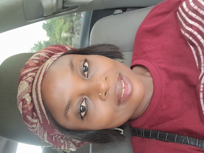 The scene takes place inside a vehicle, identified as being in the city of Ikota, Nigeria. The primary subject is an adult female with dark skin and dark, shoulder-length hair, occupying the front passenger seat. She wears a maroon and beige patterned head wrap, a maroon long-sleeved top with a light-colored wavy pattern on the chest, a small gold-colored stud in her right nostril, and a dangling earring on her left ear. A black, textured strap is visible over her left shoulder. She has a neutral expression with a slight closed-mouth smile, looking directly at the viewer. Behind her, a gray vehicle headrest and seatback are visible. Through the vehicle's right-side window, an exterior environment featuring dense green foliage and an indistinct light-colored vertical structure is visible under an overcast sky.