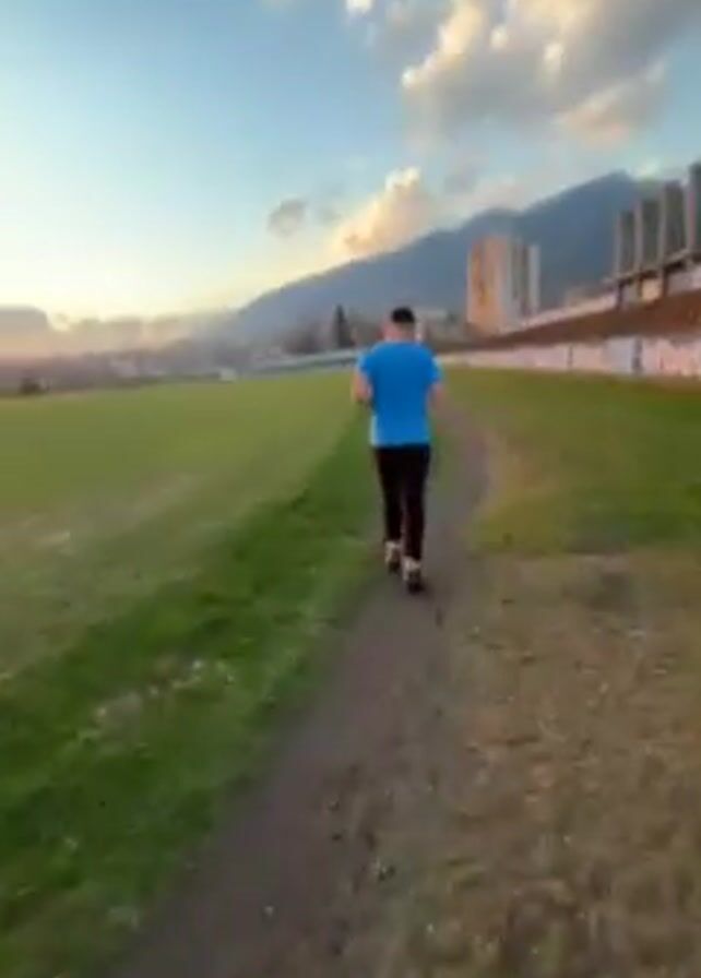 Here's a detailed description of the video: The video shows a person jogging on a dirt path next to a large green field. The individual is wearing a blue t-shirt and dark pants. They're running away from the camera. To the side of the field is a structure, possibly part of a stadium or building complex. In the distance, a mountain range is visible, and the sky is a mix of blue and clouds with a sunset in the distance. The camera seems to be moving along with the runner.