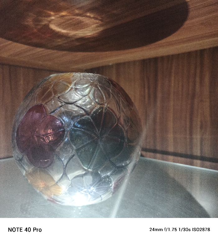 - "A glass sphere with colorful flower-like patterns sits on a reflective surface within a wooden cabinet" by FM-eI8CE3, licensed under CC BY 4.0