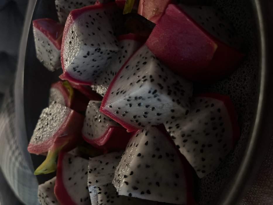 - "The scene depicts a close-up, slightly overhead view of numerous irregularly cut pieces of dragon fruit (pitaya) contained within a dark, possibly ceramic, bowl with a textured interior surface" by FM-dkMlc2, licensed under CC BY 4.0