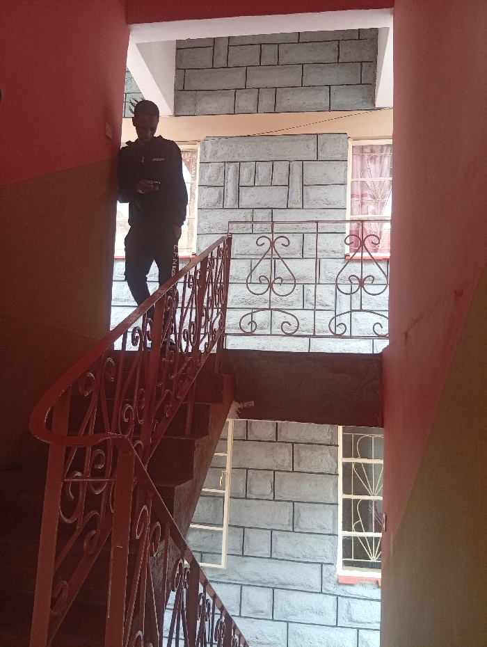 The image depicts the interior of a multi-story building, likely an apartment complex or commercial structure, located in Nyeri, Kenya. A single male individual, dressed in a dark long-sleeved shirt and dark pants, is standing on a landing or upper step of a staircase, leaning against a pink-orange painted wall on the left side of the frame. He is actively engaged with a mobile phone held in both hands, looking down at the device. The staircase, prominently featured in the foreground and extending downwards, consists of concrete steps painted a distinct reddish-orange hue. It is equipped with an ornate metal balustrade and handrail, also painted red, featuring scrollwork designs resembling hearts and circles. In the background, sections of walls are visible with a grey faux-stone block pattern, accented by dark grout lines. Multiple rectangular windows with white frames and internal security bars are present in these grey walls, some draped with sheer, light-colored curtains that appear pinkish or reddish. Natural light enters the scene through these windows, illuminating the stairwell. The architecture suggests a functional yet somewhat decorative design, typical of multi-unit buildings.