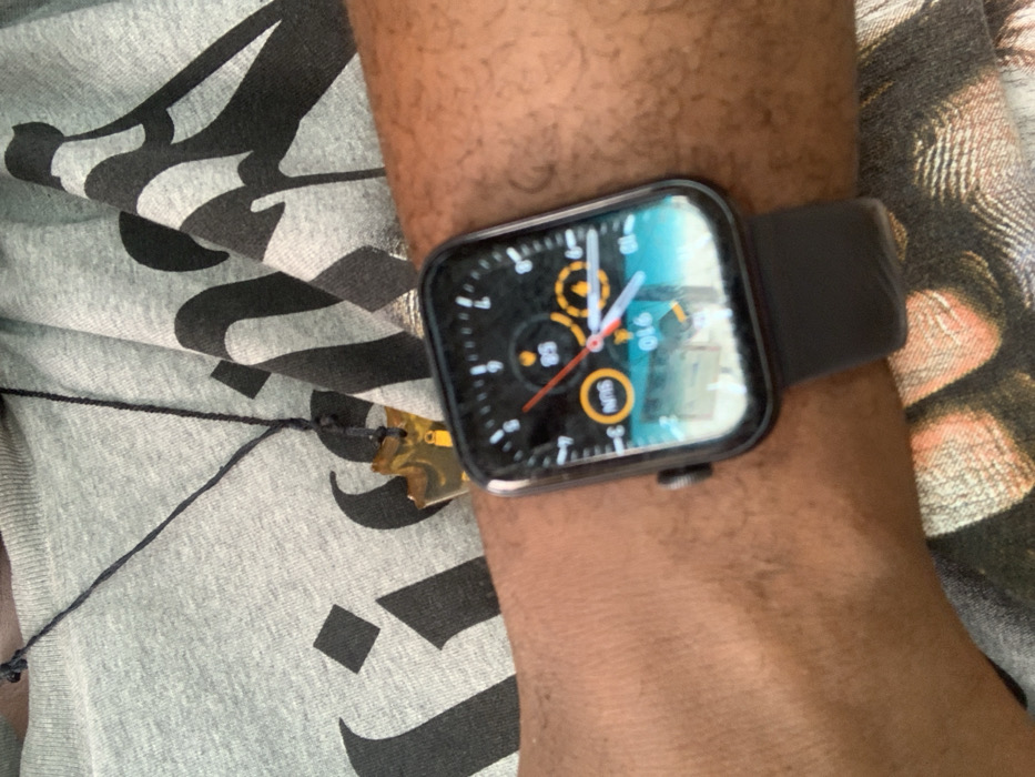A close-up shot shows a person's arm wearing a square-faced smartwatch with a black band