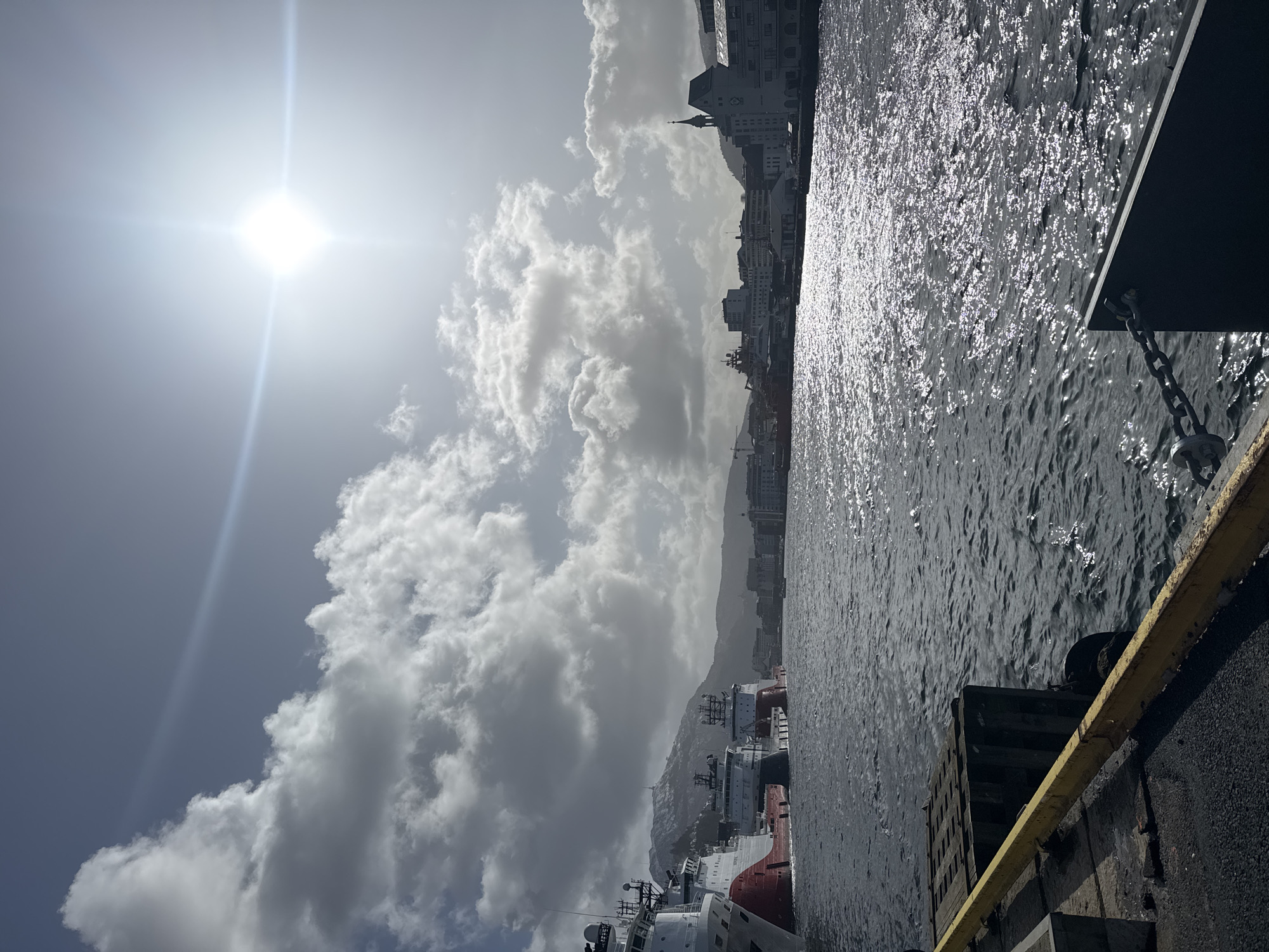 This image depicts a sunlit harbor scene in Bergen, Norway, viewed from a dockside perspective. The bright sun, positioned high in the upper right, casts a strong glare across the water surface, creating shimmering reflections. The sky is partially covered by large, distinct white and grey cumulus clouds. In the immediate foreground, a dark asphalt surface transitions into a concrete or wooden dock structure featuring a prominent yellow-painted metal barrier running horizontally across the lower left. A dark wooden mooring post is visible directly behind this barrier, and a thick metal chain is attached to a dark plate-like object near the lower right edge, extending towards the water. The midground is dominated by the dark, choppy waters of the harbor, intensely reflecting the sunlight. To the left, several large ships, characterized by white superstructures and red hulls, are moored alongside a quay. These vessels appear to be offshore supply or research ships, with visible antennae and various deck structures. In the background, a range of mountains rises. The mountain directly behind the ships on the left exhibits patches of snow or light vegetation, with a visible communication tower or similar structure near its summit. To the right, the city skyline of Bergen stretches along the water's edge, composed of various buildings, including a prominent light-colored structure with a pitched roof and a slender spire or tower. Cranes and other port infrastructure are discernible among the urban development. No individuals or specific actions are visible in the frame.
