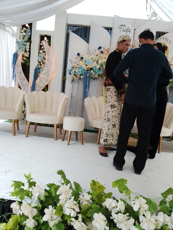 This image captures an indoor event setup, likely a wedding ceremony, in Juwana, Indonesia. The scene is dominated by a white aesthetic, featuring a white draped ceiling and a uniform white floor covering. At the rear, a decorative white backdrop consists of multiple tall, wavy panels, some incorporating dark vertical sections. These panels are adorned with arrangements of white and light blue flowers, interspersed with green foliage. On the left, two large, crescent-shaped white lace decorations, internally illuminated, are mounted vertically. To the right, another floral arrangement, predominantly blue and white, features hanging blue fabric strips. Above the right-hand floral cluster, a white panel displays the calligraphic name "Taufiq." In the mid-ground, three scallop-backed, cream-colored armchairs with light wooden legs are arranged, along with one matching circular stool. Three individuals are standing in the center-right of the frame. The central figure, a male, is dressed in traditional Indonesian wedding attire, including a black long-sleeved top with gold embroidery, a patterned brown and cream sarong (batik), and a white, intricately designed headpiece. He stands facing slightly away from the camera. To his right, partially obscuring a female figure, stands a second male, seen from behind, wearing a dark blue long-sleeved collared shirt and black trousers. The female figure, mostly obscured, is wearing a dark garment with visible gold embroidery and dark shoes. The individuals appear to be conversing or standing in preparation for an event. In the immediate foreground, a low arrangement of white flowers and green leaves is visible.