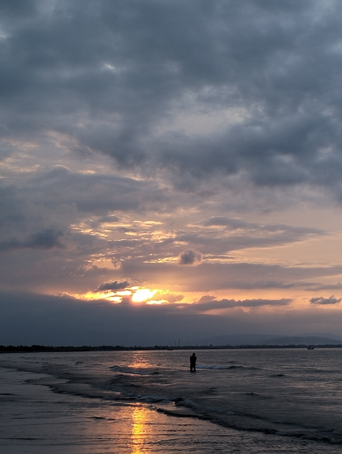 The scene depicts a coastal area in Curehtunong, Indonesia, at sunset. A solitary human figure, silhouetted and appearing to be an adult, stands waist-deep in the ocean water, positioned slightly to the right of the frame's center and facing away from the viewer. The sky is largely overcast with dark grey clouds, but the setting sun breaks through a band of clouds on the horizon, casting an intense orange and yellow glow that reflects brightly on the water's surface towards the foreground. Distant landmasses, possibly hills or mountains, are visible on the horizon, with faint industrial structures discernible on the far left coastline and a small vessel on the water to the far right. The immediate foreground consists of wet sand and gentle ocean waves.